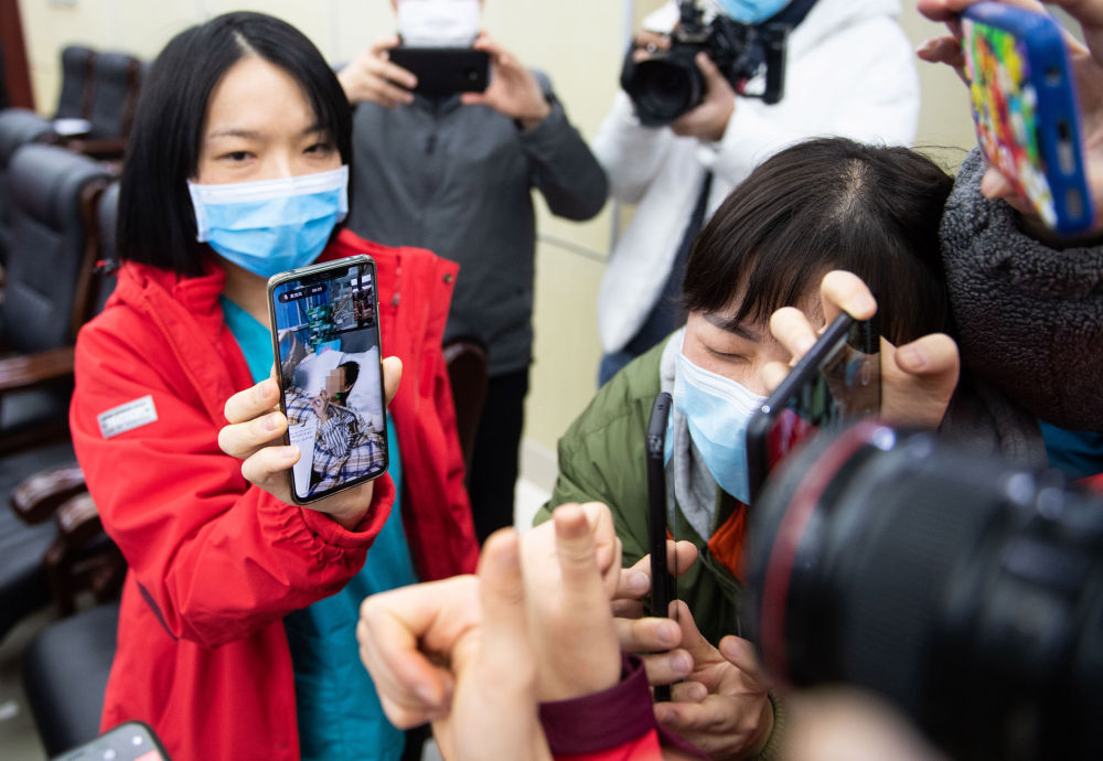 3月4日,在株洲市新冠肺炎定点集中隔离救治医院,邓女士通过视频连线接受记者采访。新华社发(陈思汗摄)