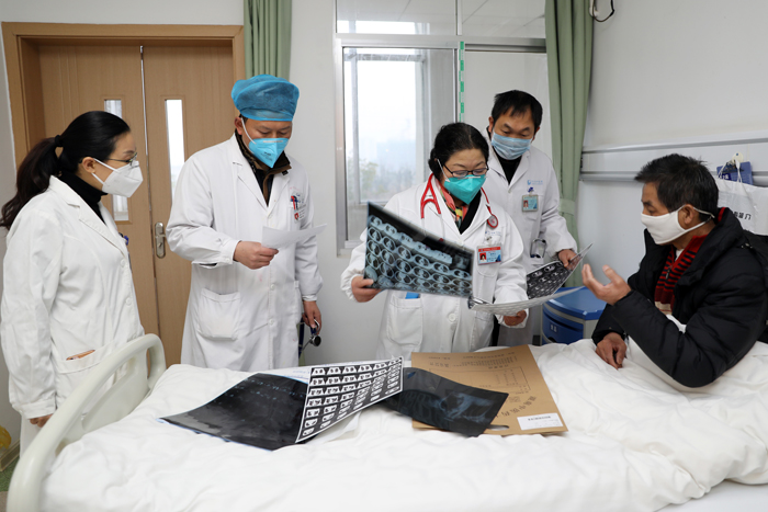 当天早上7时50分,湖南省胸科医院耐药专科主任、医务部主任、防治部主任、护理部主任、外科郑正主任医师等医疗专家就来到常德市第四人民医院感染科,与医院感染科医护人员一道进行查房,查看患者胸部CT片,对住院接受治疗的患者进行一对一的健康教育,并针对性的调整患者治疗方案。