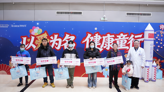 实验秀的暖意尚未褪去,爱心捐赠环节让现场温度再度攀升。医院联合中国红十字基金会合生元母婴救助基金为10户经济困难的住院患儿家庭送去了慰问金与关怀,医院党委书记、副院长还有爱心企业代表等共同将这份温暖送到了患儿家长手中。受到爱心帮助的这些家庭中,琛琛的就诊故事令人格外揪心。2024年,他因食物卡喉被紧急送到医院抢救,由于病情危重,辗转多地治疗,如今家中积蓄早已耗尽。这笔善款,恰似一束微光,为这个家庭的求医路带来温暖与前行的力量。