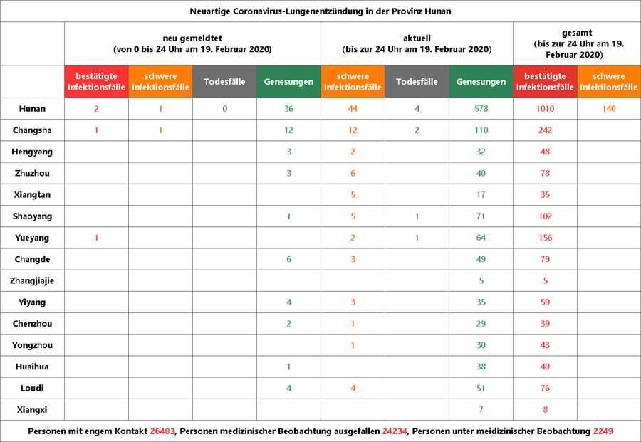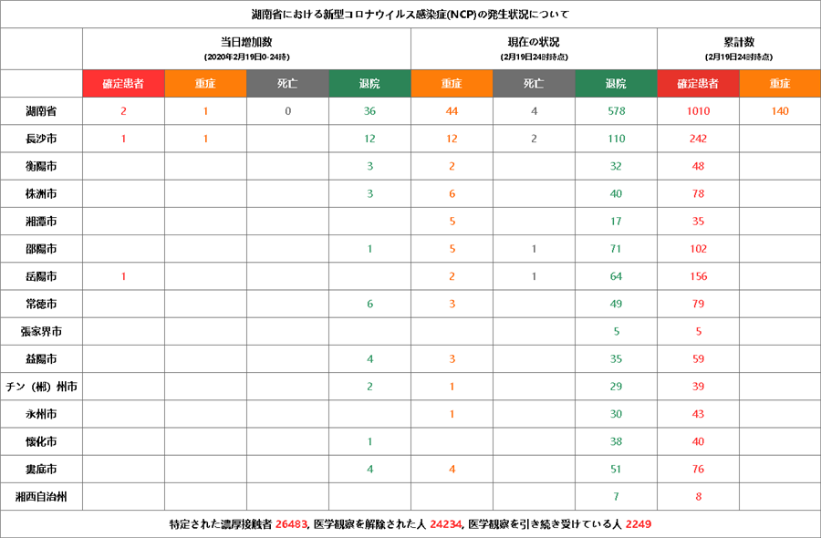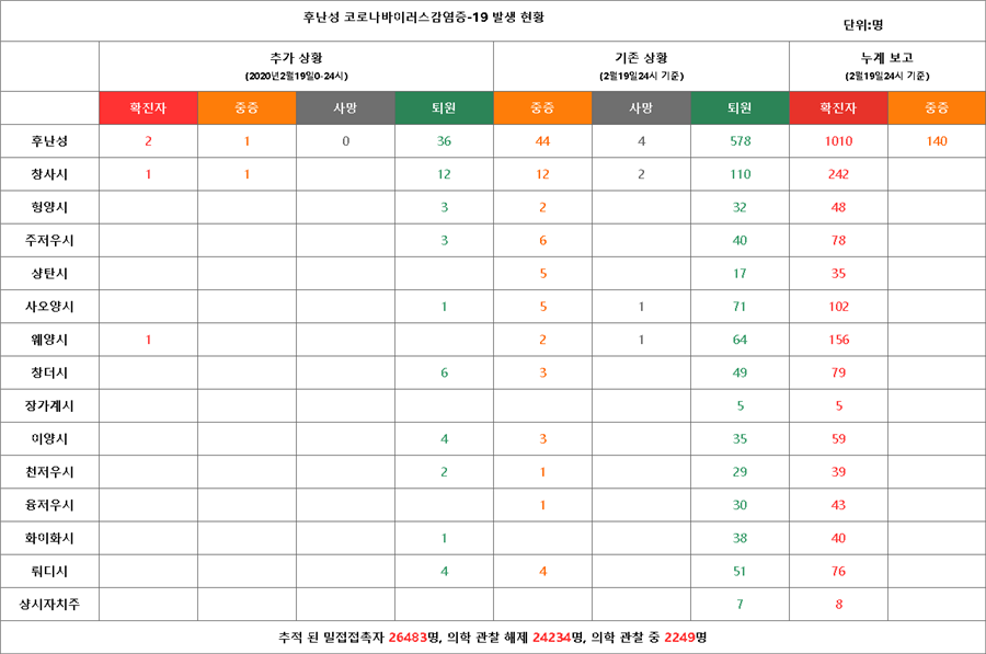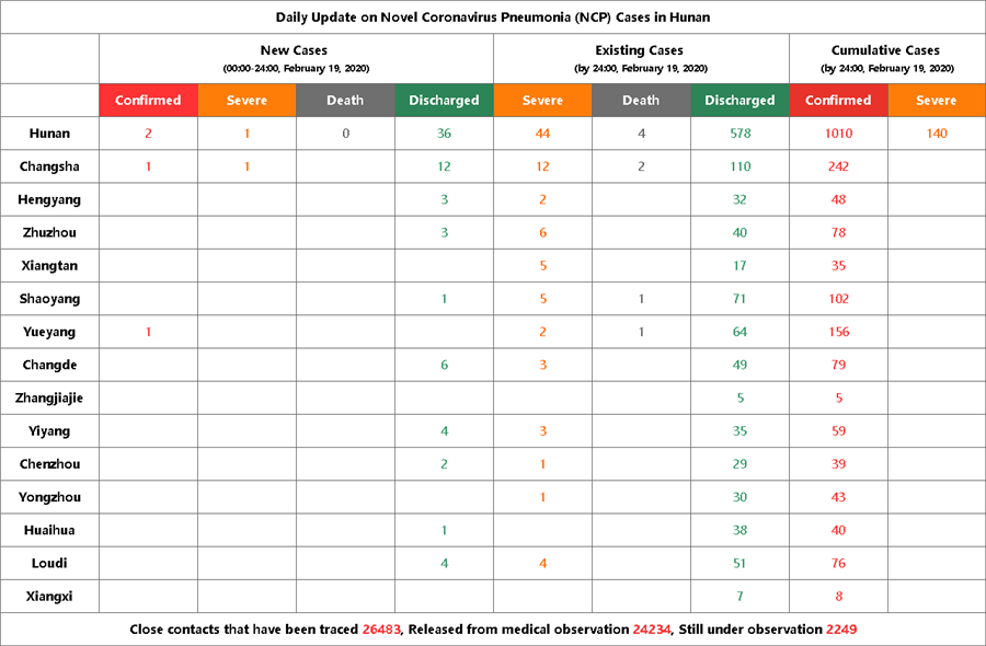 湖南省新型冠状病毒肺炎疫情信息(截至2月19日24时)