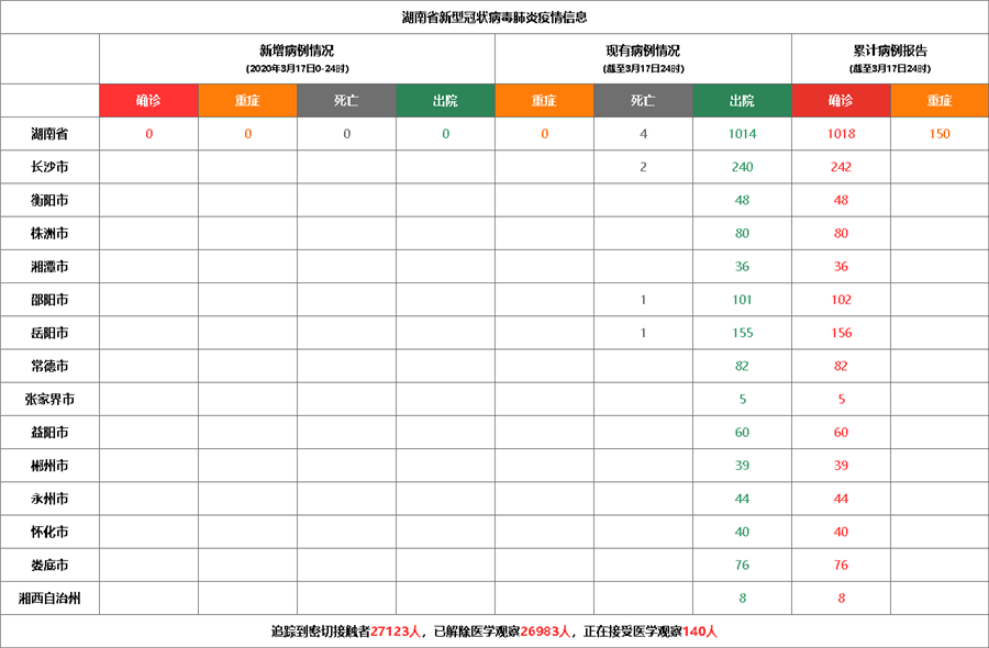 湖南省新型冠状病毒肺炎疫情信息(截至3月17日24时)