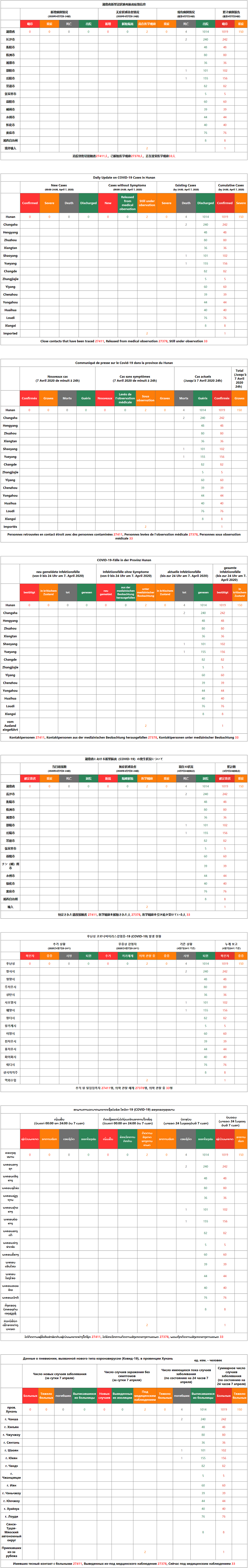 4月8日湖南省新型冠状病毒肺炎疫情信息(含中英法德日韩老俄8国语言版本)