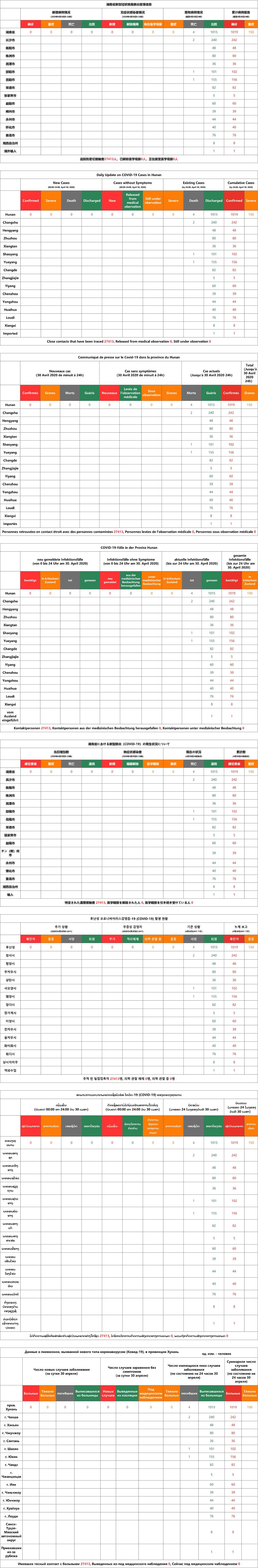 5月1日湖南省新型冠状病毒肺炎疫情信息(含中英法德日韩老俄8国语言版本)
