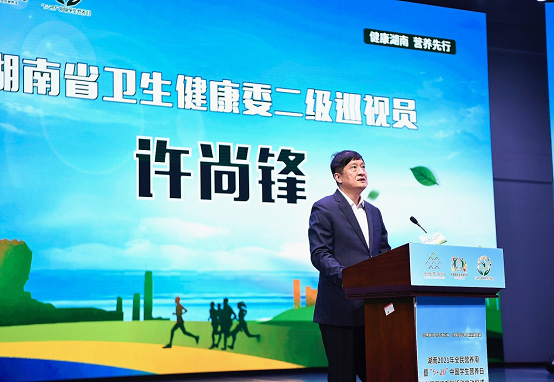 许尚锋梳理了近年来省卫生健康委高度重视并积极推进过的营养健康工作,如推动出台了《湖南省国民营养计划2030实施方案》和《健康湖南行动实施意见》,牵头成立了湖南省国民营养健康指导委员会,实施了临床营养干预行动和特殊人群营养干预项目,启动了健康食堂(餐厅)和营养健康示范学校试点建设等。他倡导“每个人都是自己健康的第一责任人”,要求全省卫生健康系统认真履行营养健康牵头部门的工作职责,进一步将加大宣传力度,推动将科学的营养健康理念、知识与技能进社区、进学校、进单位、进市场、进家庭,培育人人参与、人人建设、人人共享的全面营养健康新生态,使营养健康成为社会共识和自觉行动。他同时呼吁:社会各界共同践行“三减(减盐、减油、减糖)三健(健康口腔、健康体重、健康骨骼)”、戒烟限酒等健康生活方式,共同做到合理膳食、增强免疫力,打好身体健康的基础;共同关心儿童青少年营养,守护民族健康的未来;共同做到文明就餐、减少浪费,树立健康饮食新风尚。