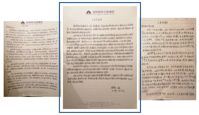 这些入党申请书长短不一,有的是用驻地宾馆的信纸书写的,有的是撕下笔记本的纸张写的;有的笔迹娟秀,有的稍显潦草。但字里行间,情真意切,催人奋进。