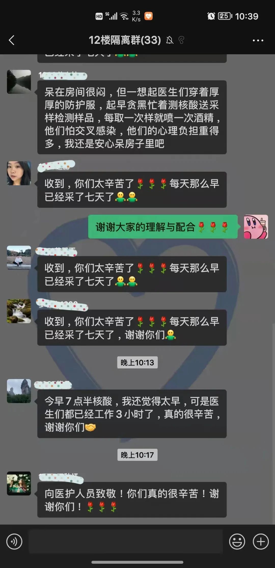 考虑到本次接收的隔离人员主要是高中的学生,容易产生紧张、焦虑的情绪。为了及时了解隔离人员的需求,解决实际困难,医疗队以层为单位建立了隔离人员微信生活群,与他们耐心沟通,及时帮助解决反映的各种问题,尽职尽责,毫不松懈。“不管大事小事,白天晚上,只要有问题,都能得到医护人员的及时解答和帮助。”一名学生在微信群表达了真挚的感谢。