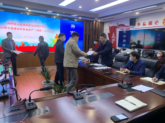 为深入贯彻落实省卫生健康委关于2022年平安建设和安全生产(消防)工作的决策部署,积极推进中心平安建设、信访稳定、安全生产和疫情防控等各项工作,4月18日上午,湖南省卫生健康委信息统计中心在二楼会议室召开专题工作会议。会议传达省卫生健康委4·13会议上小松主任的讲话精神,并举行本年度中心平安单位建设和安全生产(消防)工作责任书签订递交仪式。中心全体干部职工参会,会议由中心主要负责人主持。