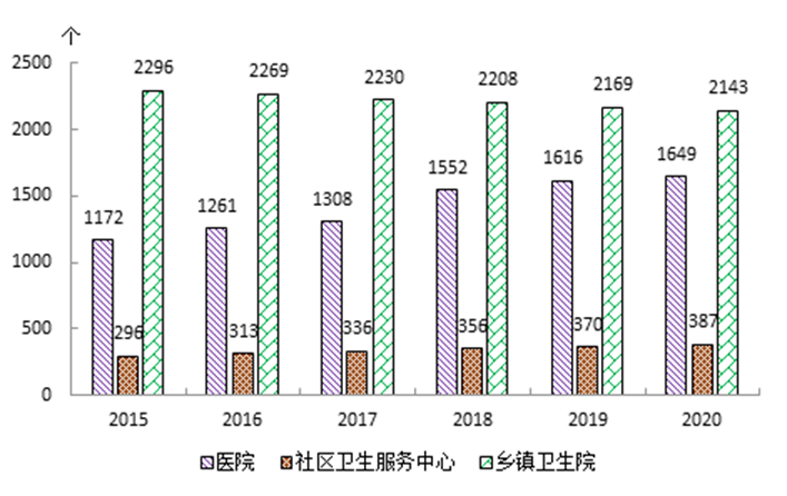 (一)医疗卫生机构总数(见表1)。2020年末,全省医疗卫生机构总数56042个,比上年减少1190个。其中:医院1649个,基层医疗卫生机构53796个,专业公共卫生机构535个。与上年相比,医院增加33个,基层医疗卫生机构减少1061个。
